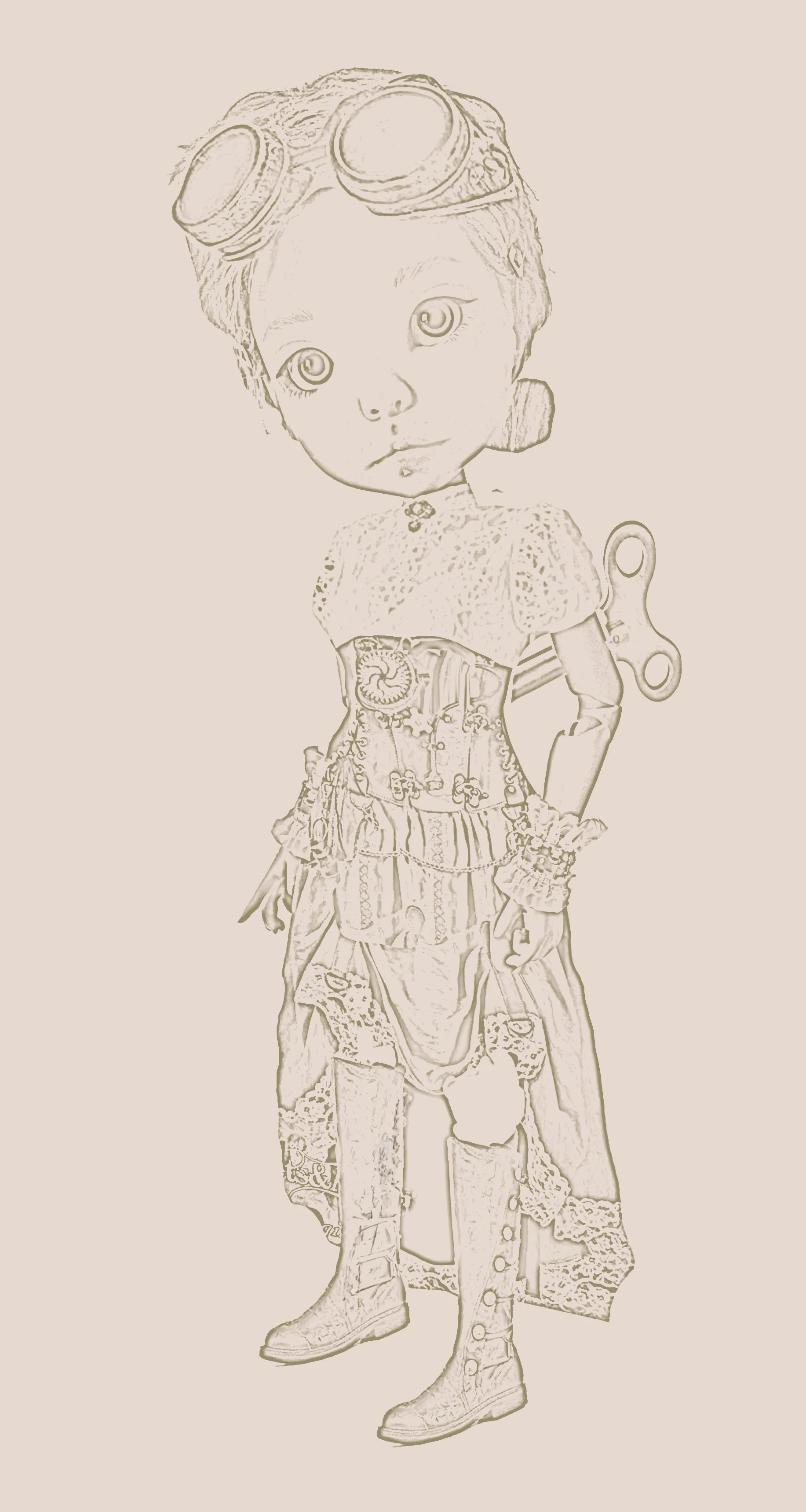 Evangeline arrives in a brand-new 12” size in tan resin. She comes as a full set in a complete Victorian steampunk costume—corset, boots, goggles, bloomers, et al!. She has chestut eyes and a mixed blonde wig, and carries a magical pocket watch (as all steampunk adventurers do!) and comes with a removable wind-up key on her back. She is hand painted by Sandra.