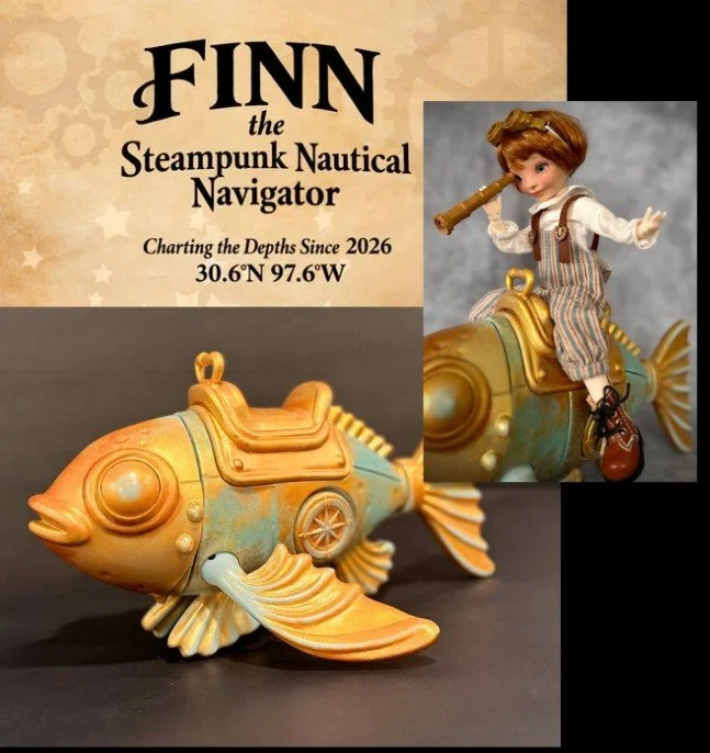 Sandy has also created the perfect companion for FINN—a Mini Celeste as a steampunk fullset. She will be available for purchase as an add-on to workshop attendees first. Should a few extra FINNs and/or Mini Celestes spring to life from our gears and gizmos, they’ll happily swim their way to Sandy’s table in the salesroom!